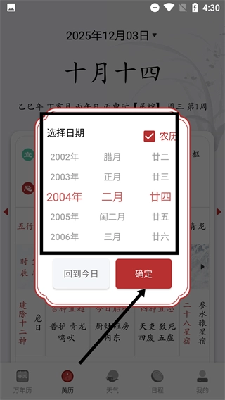 4、在【选择日期】弹窗里点击【确定】按钮,就能切换到选定日期的黄历页面,查看该日期对应的宜、忌、五行等信息。