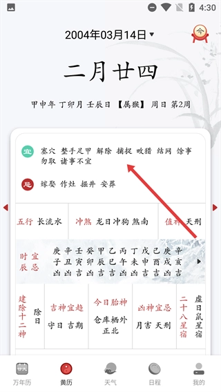2、加入了黄历功能,用户能够查看每日的宜忌内容,给日常生活提供参考。
