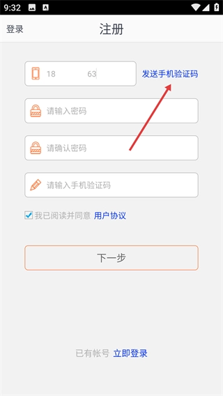3、在号码输入框中填写好号码后,点击【发送验证码】按钮,即可获取注册所需的验证信息。