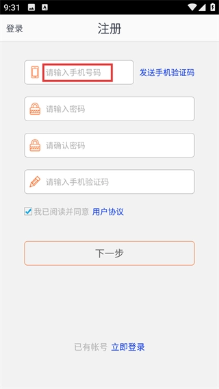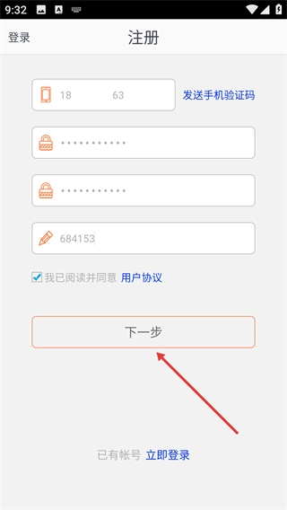 4、填写密码、确认密码与验证码后,勾选【用户协议】并点击【下一步】,继续完成注册流程。