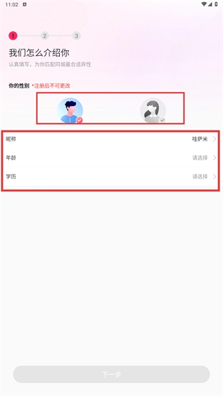 1、选择性别,填写昵称、年龄、学历等信息,完成资料填写以推进流程。