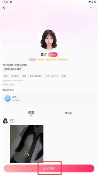 3、进入用户详情页后,点击【打招呼】按钮,即可向对方发起互动。