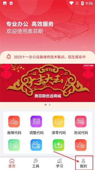 1、进入【奥菲斯】首页后,既能查看【2025十一办公设备维修技术集训】的报名信息,也可以点击底部的【我的】按钮进入个人中心。