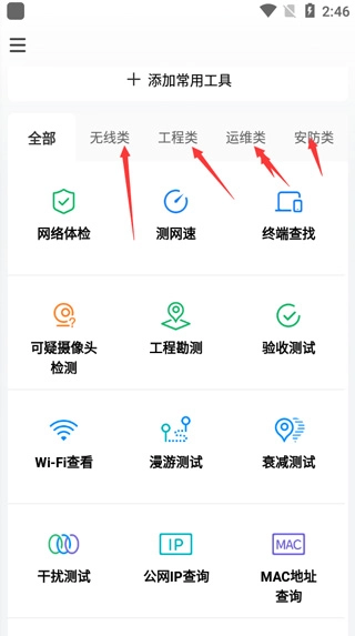 1、无线类小工具:网络体检、网速测试、终端查找、摄像头检测、Wi-Fi查看、漫游测试;