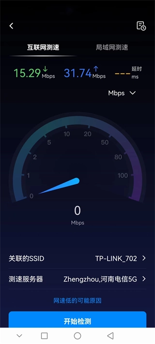 点击测网速按钮,可以测试网络的上传和速度。