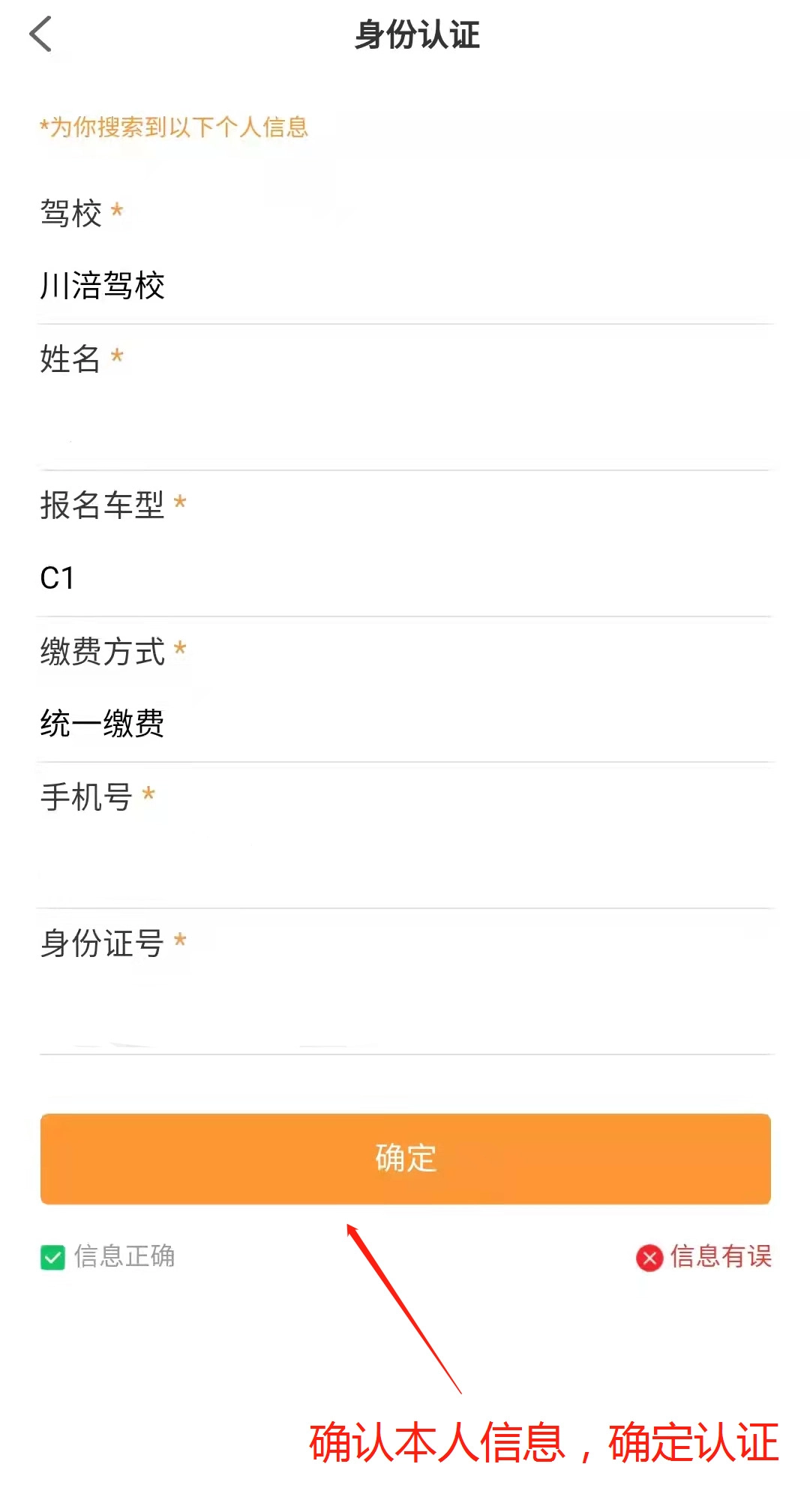 2、需输入身份证号码完成绑定操作,在核对驾校信息准确无误后,才可确认完成认证流程。