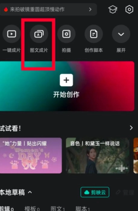 2.文案自动生成后,可以剪映,点击图文成片功能;