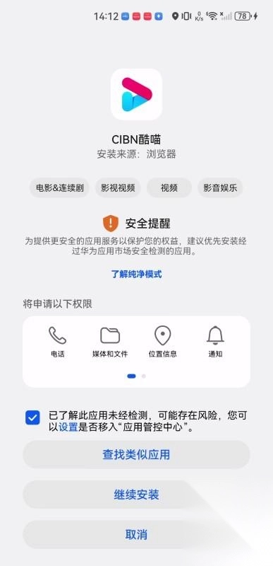 3、第三步,点击勾选“已了解此应用未经检测……”,然后再点击“继续安装”。(出现安全提醒,不用惊慌)