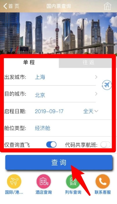 3.选择出发地和目的地等信息即可查询航班或火车