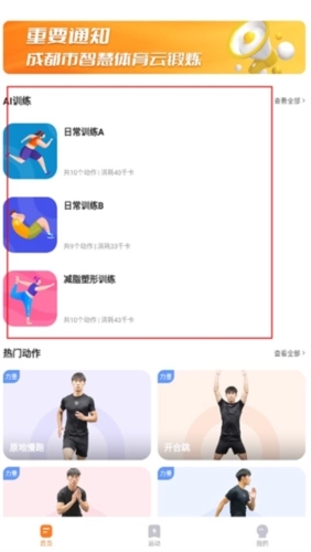 2、进入首页后,能看到不少AI运动训练项目,你可以挑选自己感兴趣的来进行锻炼。