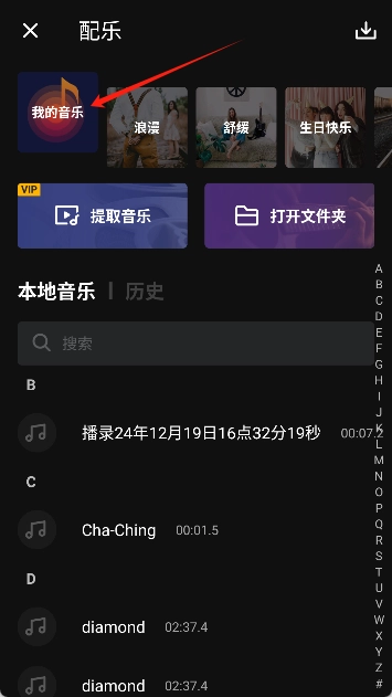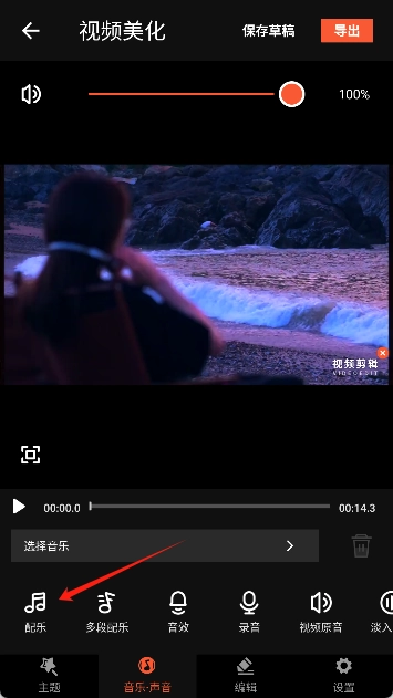 4、在编辑界面中点击“配乐”选项开始添加音乐。