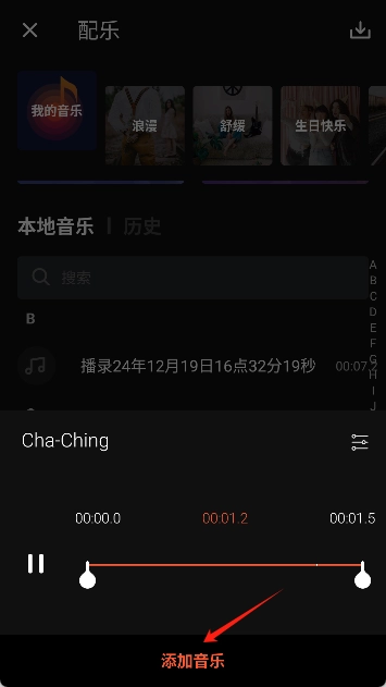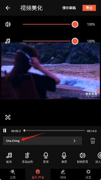 7、添加操作完成后,编辑界面里就会呈现出该音乐的名称。