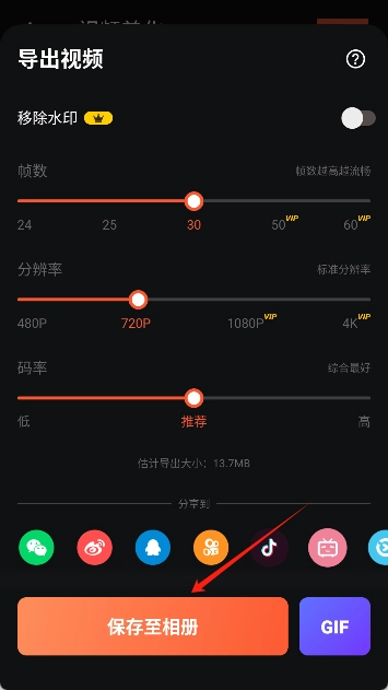 8、点击“保存到相册”后,我们的视频就会开始渲染并完成保存。