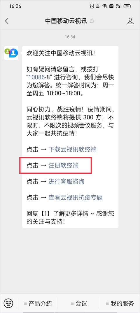 1、第一步先关注“中国移动云视讯公众号”,接着点击“注册软终端”。
