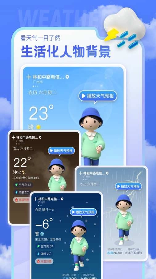 3、天气界面简洁明了,配备了生动的天气动画,还有全新设计的精致人物动画效果。