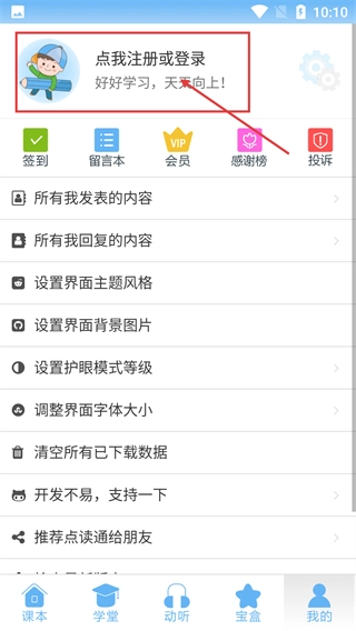 1、进入“我的”页面后,点击顶部的【点我注册或登录】区域,即可进入账号操作界面,此页面还设有签到、留言本等功能选项。