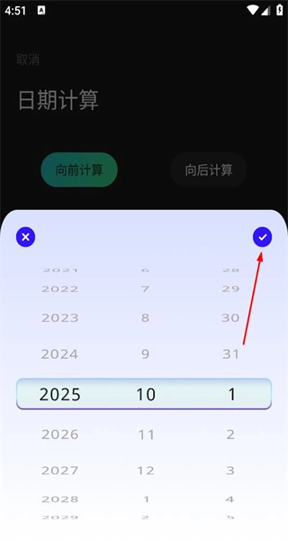 3、进入日期选择界面后,选定2025年10月1日作为起始时间,点击确认按钮,即可回到日期计算页面。