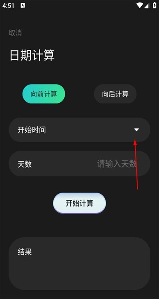2、进入日期计算页面后,会看到“向前计算”和“向后计算”两个选项,接着点击开始时间旁的下拉按钮来选择日期。