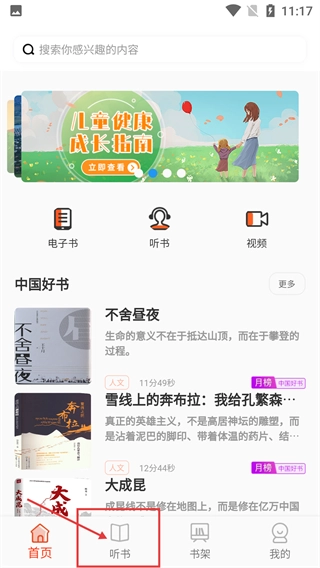 1、在应用首页点击底部的【听书】按钮,即可进入听书板块;首页同时设有【电子书】【视频】等功能入口,方便用户访问各类不同内容。