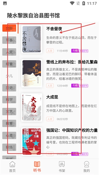 进入听书页面后,你可以借助左侧的分类功能来筛选资源,找到像【不舍昼夜】这样的听书内容,这个页面还呈现了多部上榜的听书作品。