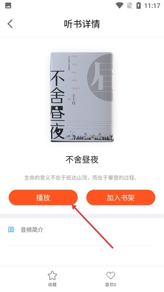 3、进入【不舍昼夜】的听书详情页面,点击【播放】按钮就能开始收听,还可以点击【加入书架】按钮,把该内容收藏起来方便后续查看。