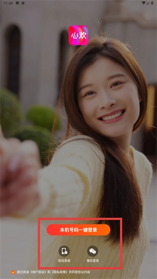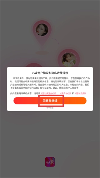 1、阅读【心欢用户协议和隐私政策提示】后,点击【同意并继续】按钮,即可进入应用的登录流程。