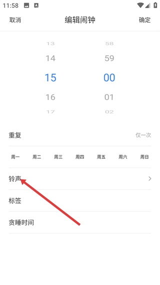 2、进入闹钟编辑界面后,通过滑动操作将时间调整到想要的数值,接着点击【铃声】选项,就能进入铃声设置页面。
