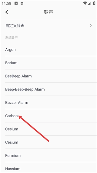3、在铃声设置页面选择系统铃声(例如【Carbon】),即可完成闹钟铃声的配置。