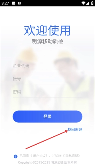 1、在【明源移动质检】的登录页面,可通过点击【找回密码】选项来重置密码。