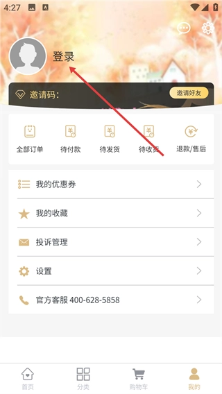 1、在“我的”页面,点击【登录】按钮即可进入登录界面,此外,订单管理、优惠券管理、收藏管理等功能也可在此页面操作(这些功能需登录后才能使用)。