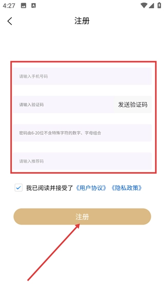 3、进入注册页面后,按顺序填写【请输入号码】【请输入验证码】【密码】等相关信息,勾选协议条款后,点击【注册】按钮即可完成账号的创建。