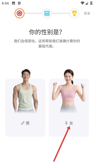 进入页面后,选择对应的性别选项(例如【女】),系统会依据该信息协助计算基础代谢,从而完成初始信息的填写。