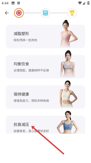 2、在目标选择页面,可选择【抗衰减压】等需求选项,该选项对应的服务方向为“延缓衰老-身心更健康状态好”。