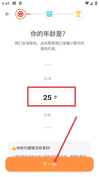 4、选择对应年龄(如【25-岁】)后,查看代谢情况提示,点击【下一步】按钮,继续完善个人信息。
