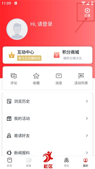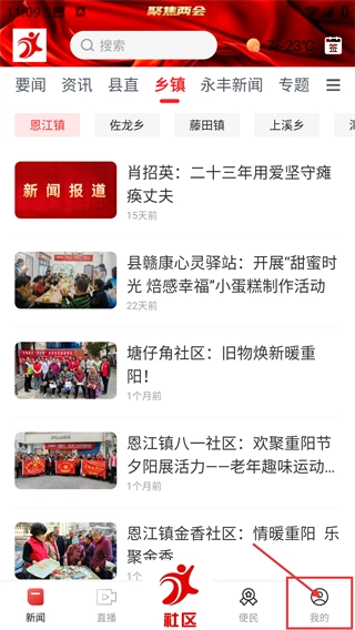 1、进入展示乡镇新闻的社区页面后,点击底部导航栏的【我的】选项,即可进入具备互动功能的个人中心页面。