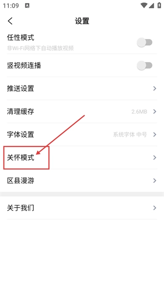 3、进入设置页面后,找到【关怀模式】选项并点击,就能开启更适合老年人使用的界面显示模式,让资讯浏览体验更好。