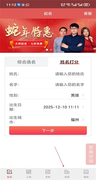 1、启动起名软件,进入起名界面,查看姓名评分表单,点击发现按钮切换到精选推荐界面。