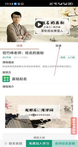 4、进入课程目录页面后,浏览各章节的具体内容,找到第一节“姓名的奥秘”,点击其对应的试听按钮即可开始学习。