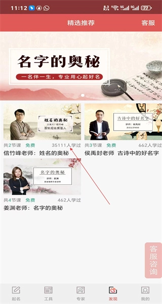 2、进入精选推荐页面,浏览各类起名课程,选择《姓名的奥秘》课程进入其详情页面。