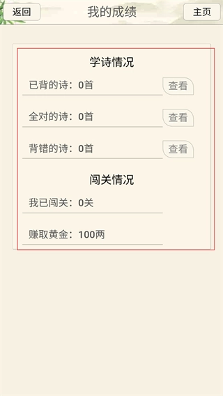 3、进入【我的成绩】页面后,能够查看【学诗情况】(包括已背诵、全部正确、背诵错误的诗歌数量)以及【闯关情况】(涵盖闯关数量、获得的黄金数量)。