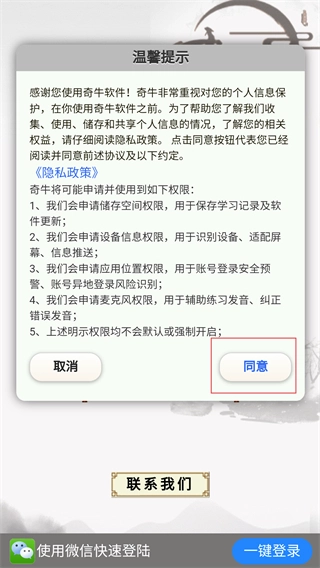 1、仔细阅读【温馨提示】中的权限说明内容后,点击【同意】按钮,确认接受相关协议,即可进入软件的功能选择界面。