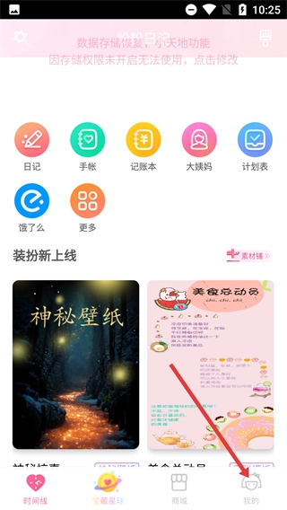 1、在应用主界面,点击底部的“我的”选项,进入对应的页面后,就能看到日记、手帐等各类功能的入口,以及相关的装扮内容。