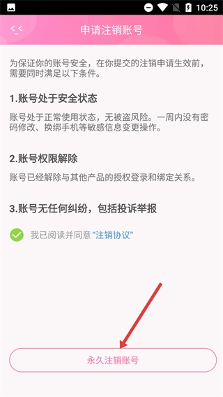 4、进入账号注销申请页面,在确认自身符合注销条件且勾选同意“注销协议”后,点击“永久注销账号”按钮来提交注销申请。