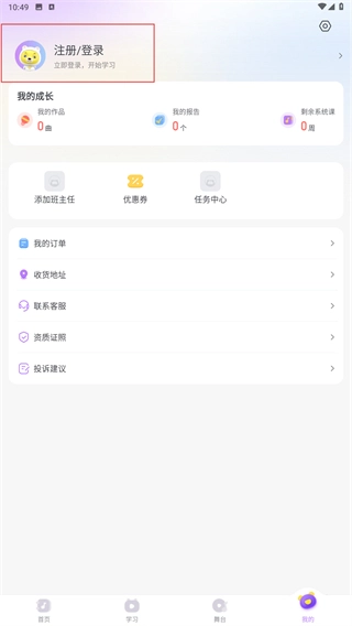 3、进入【我的】页面,点击【注册/登录】区域,通过触发登录流程来解锁更多功能权限。