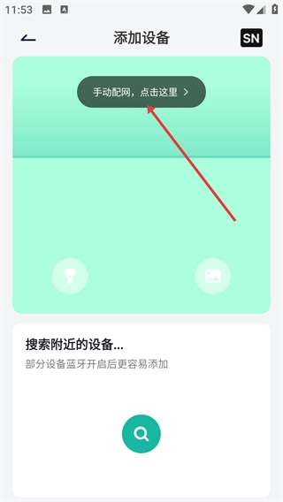 2、进入添加设备页面后,既可以选择【手动配网,点击这里】来完成配网操作,也能够搜索附近的设备(开启蓝牙会更便于添加设备)。