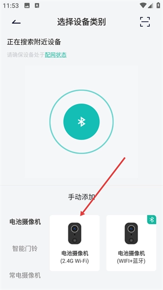 3、在设备类别选择页面,要确认设备处于可配网状态,既可以选择对应的设备类型(例如电池摄像机),也可以点击【手动添加】按钮来选择设备。