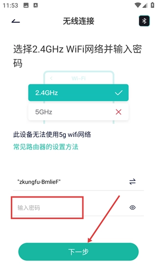 4、进入无线连接页面后,由于设备不支持5GHz网络,需选择2.4GHz WiFi,输入该网络对应的密码,然后点击【下一步】即可完成配网操作。