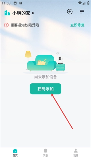 1、进入“小明的家”首页后,若页面显示“尚未添加设备”,点击【扫码添加】按钮即可启动设备添加流程,该操作同时支持修复通知权限。