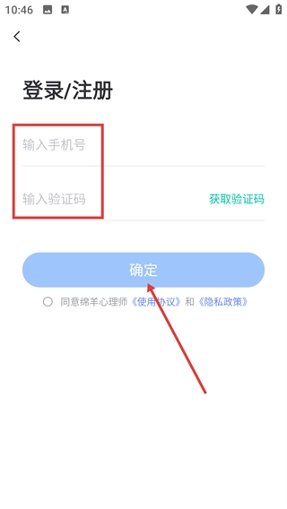 1、进入“登录/注册”页面后,先填写【输入号】,接着点击【获取验证码】并填写收到的【输入验证码】,最后点击【确定】按钮即可完成登录或注册操作。