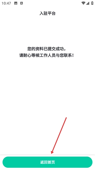 2、提交资料后,若页面显示“您的资料已提交成功,请耐心等候工作人员与您联系”,点击【返回首页】按钮,就能回到应用主界面。